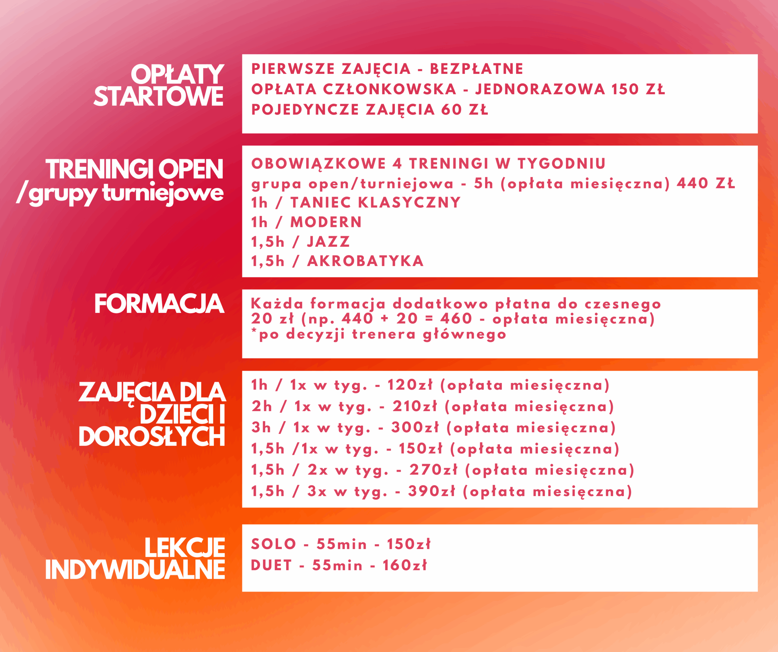 Dzięki temu nasi tancerze mają realną możliwość udziału w rywalizacji na arenie krajowej, europejskiej i światowej, reprezentując Polskę w wydarzeniach najwyższej rangi. Nasza oferta skierowana jest do dzieci, młodzieży
