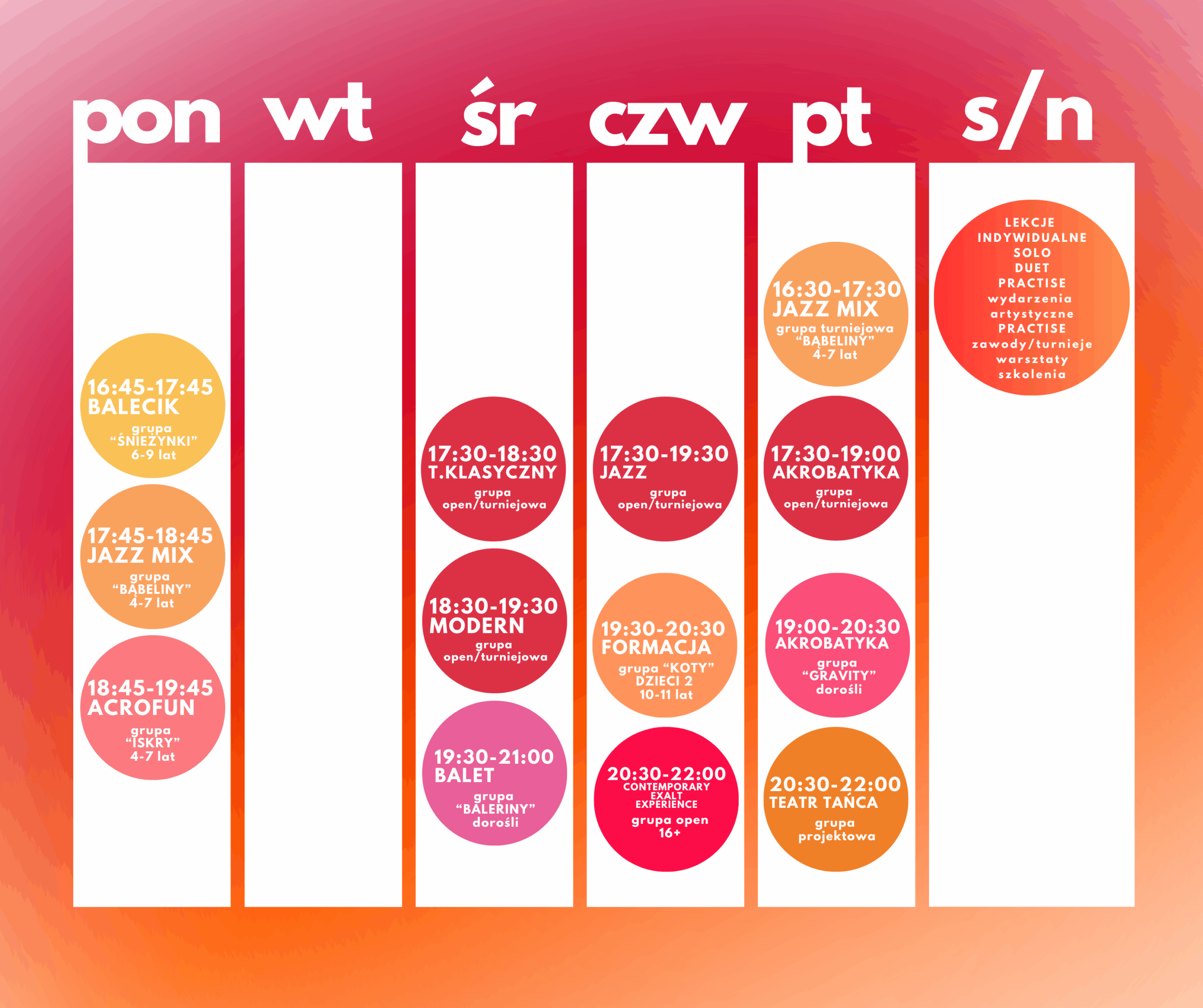 i dorosłych, którzy chcą rozpocząć lub kontynuować swoją taneczną przygodę. Oferujemy rozwój w różnych grupach wiekowych, poziomach zaawansowania oraz technikach tanecznych.